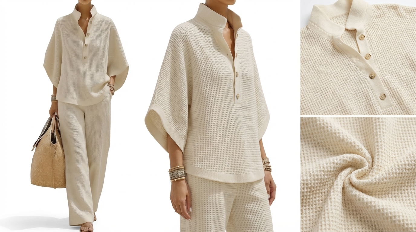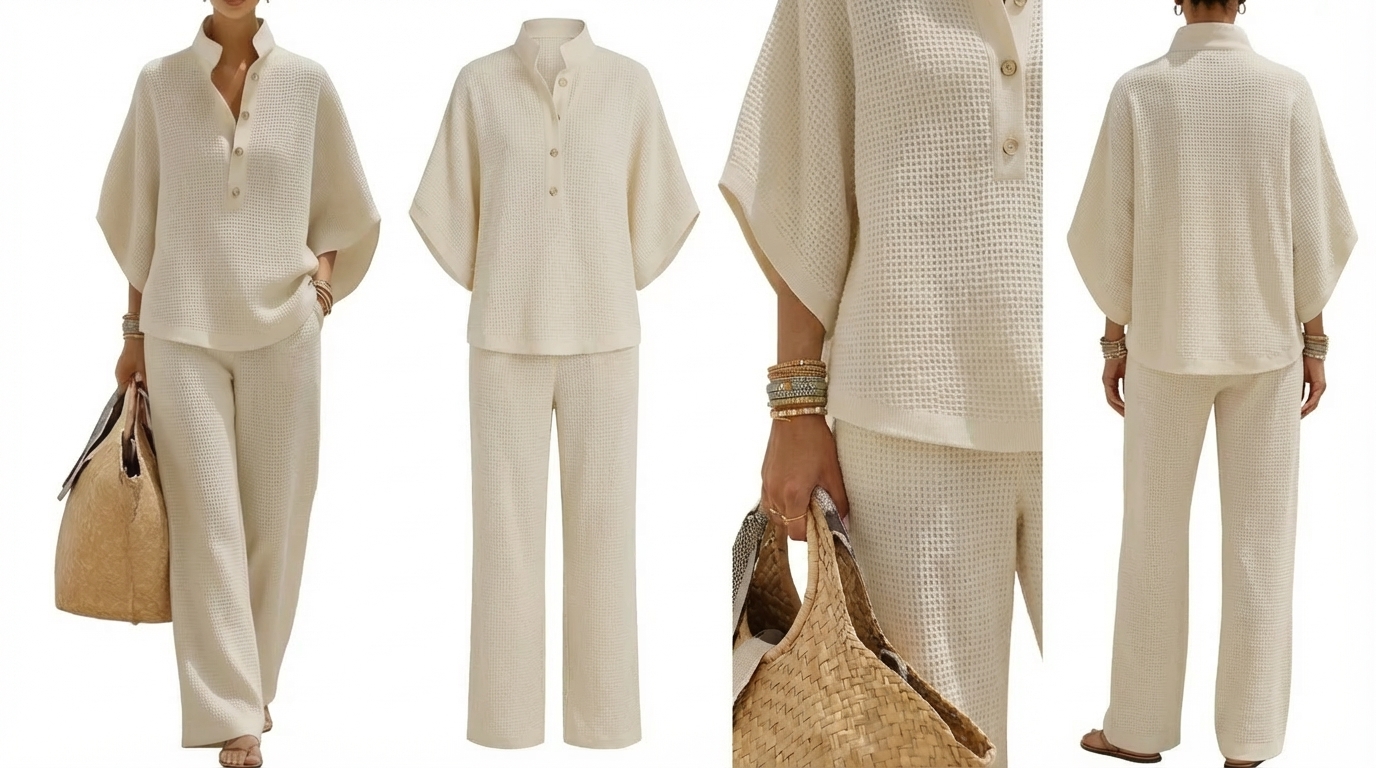 This breathable linen-cotton two-piece set features a relaxed button blouse and wide-leg pants, creating a clean, minimal, and timeless look perfect for any occasion.